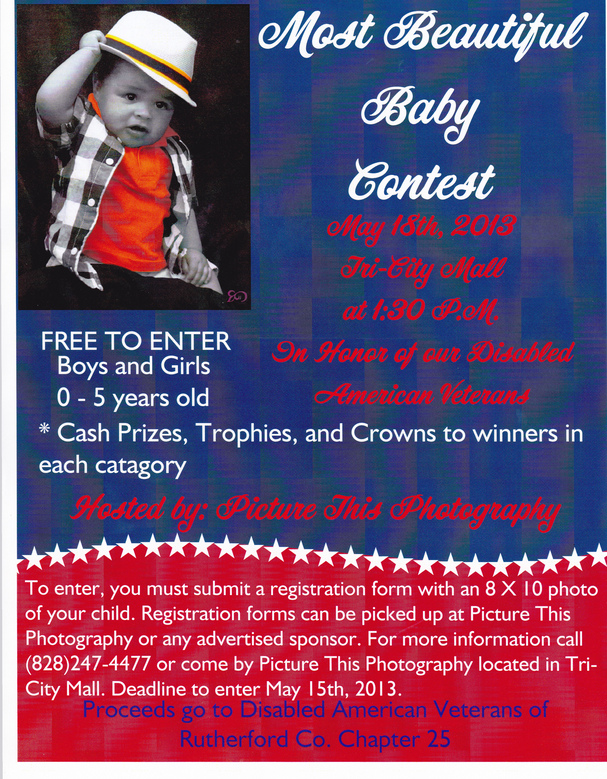 Most Beautiful Baby Contest Registration and Information can be picked up at Picture This Photography or one of our sponsors. Deadline to enter is May 15, 2013.